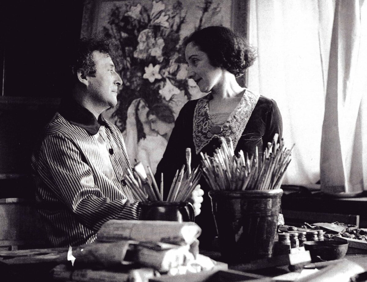 L’atmosfera è dolce, serena, vibrante, felice tanto da mettere in secondo piano l’irrazionalità dello slancio del volo. È un eterno momento di gioia iniziato nel 1909 quando, giovanissimi, si sono innamorati all’istante, lei – Bella Rosenfeld – del suo «sguardo di una volpe negli occhi azzurro-cielo e dai ricci spettinati», lui – Marc Chagall – «della sua pelle d’avorio e dai giganteschi occhi neri».