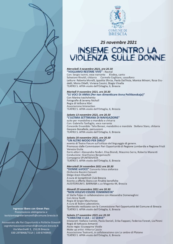 Tutti gli spettacoli sono a ingresso libero (con Green Pass) e prenotazione obbligatoria all’indirizzo di posta elettronica: iscrizionisegreteriamorelli@comune.brescia.it