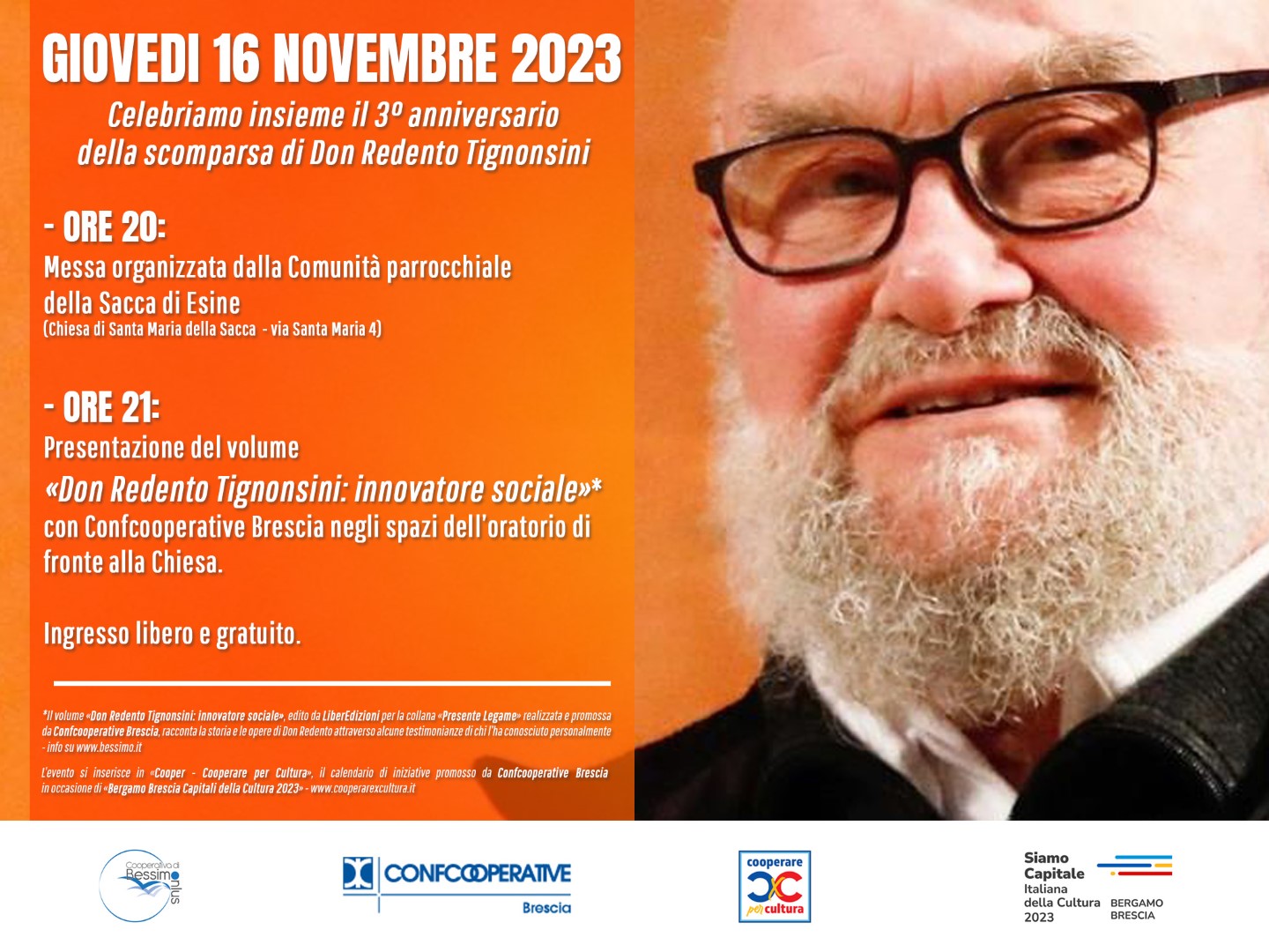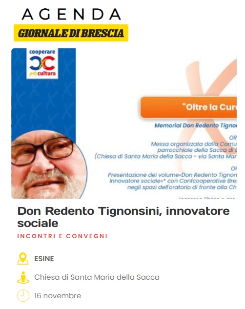 Dopo la Messa delle 20, organizzata ogni anno dalla comunità parrocchiale della Sacca, ci riuniremo, alle 21, nelle sale dell’oratorio di fronte alla chiesa e presenteremo il volume «Don Redento Tignonsini – Innovatore sociale» pubblicato nel 2021. Una bella occasione per recuperare la presentazione in programma già a inizio 2022 e bruscamente annullata causa pandemia.