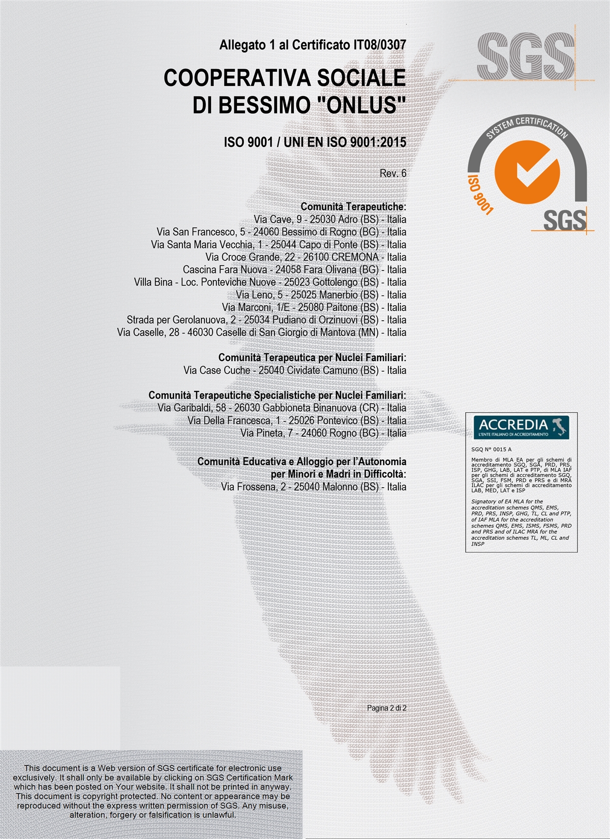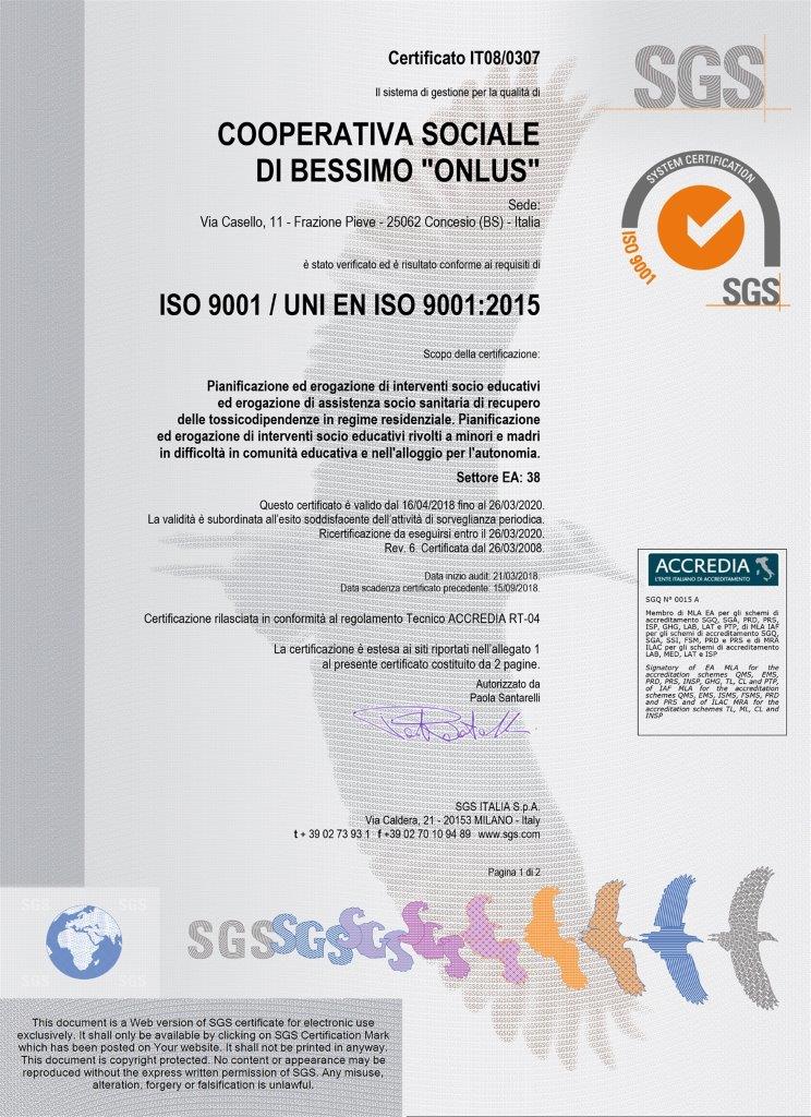 La Cooperativa di Bessimo ONLUS ha ottenuto la Certificazione di Qualità da parte di SGS ITALIA, in base alla norma UNI EN ISO 9001 edizione 2000 settore EA 38F (assistenza sociale) il 26.03.08, ed è stata ricertificata in base alla norma UNI EN ISO 9001 edizione 2008 il 06.03.09 ed in base alla norma alla norma UNI EN ISO 9001 edizione 2015 il 16.04.18.
