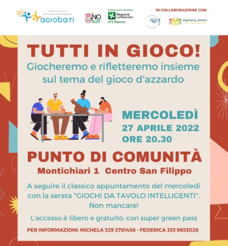 Il progetto nasce dalla collaborazione tra il Consorzio Gli Acrobati (ente capofila del progetto) e la Cooperativa di Bessimo (partner di progetto) ed è finanziato da ATS Brescia nell’ambito del «piano locale GAP (Gioco d’azzardo patologico)».