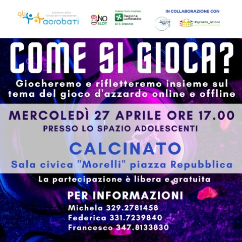 Il progetto «Controgioco», attivato nell’ambito della bassa bresciana orientale, nasce con l’obiettivo di sviluppare azioni di contrasto al gioco d’azzardo patologico e alle dipendenze, favorendo e incrementando le opportunità di sensibilizzazione e di aggancio precoce.