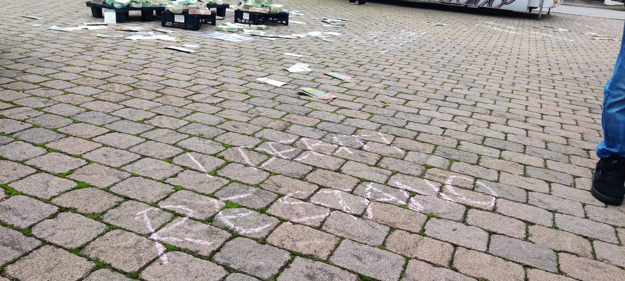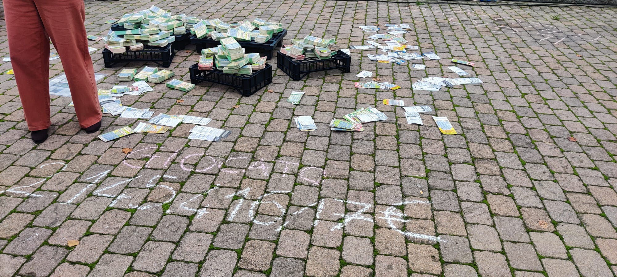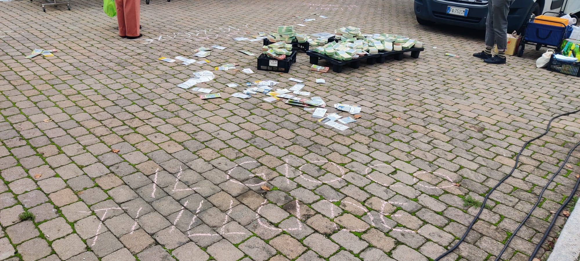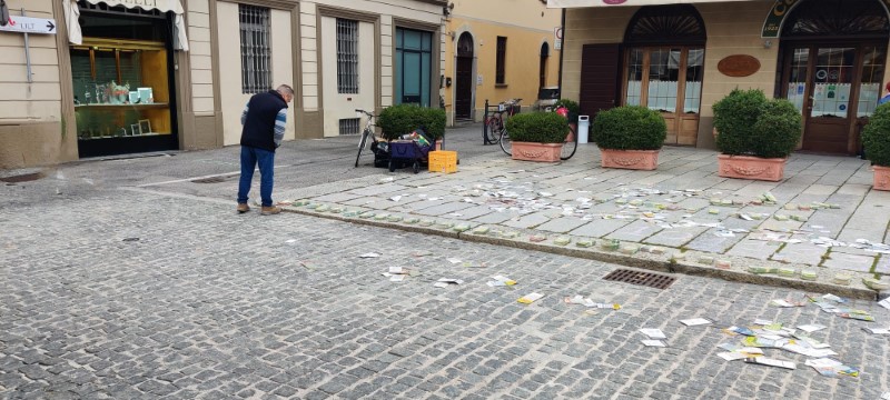 Distribuzione a terra di numerosi gratta&vinci persi, scritte con il gessetto di frasi-testimonianza di ex giocatori all’ingresso e all’uscita del mercato. Ingaggio degli avventori con spiegazione dell’iniziativa e consegna di flyer con dati del fenomeno a livello comunale e numeri utili. Intercettazione di possibili esigenze. L’età degli avventori del mercato è stata dai 50/60 anni in su.