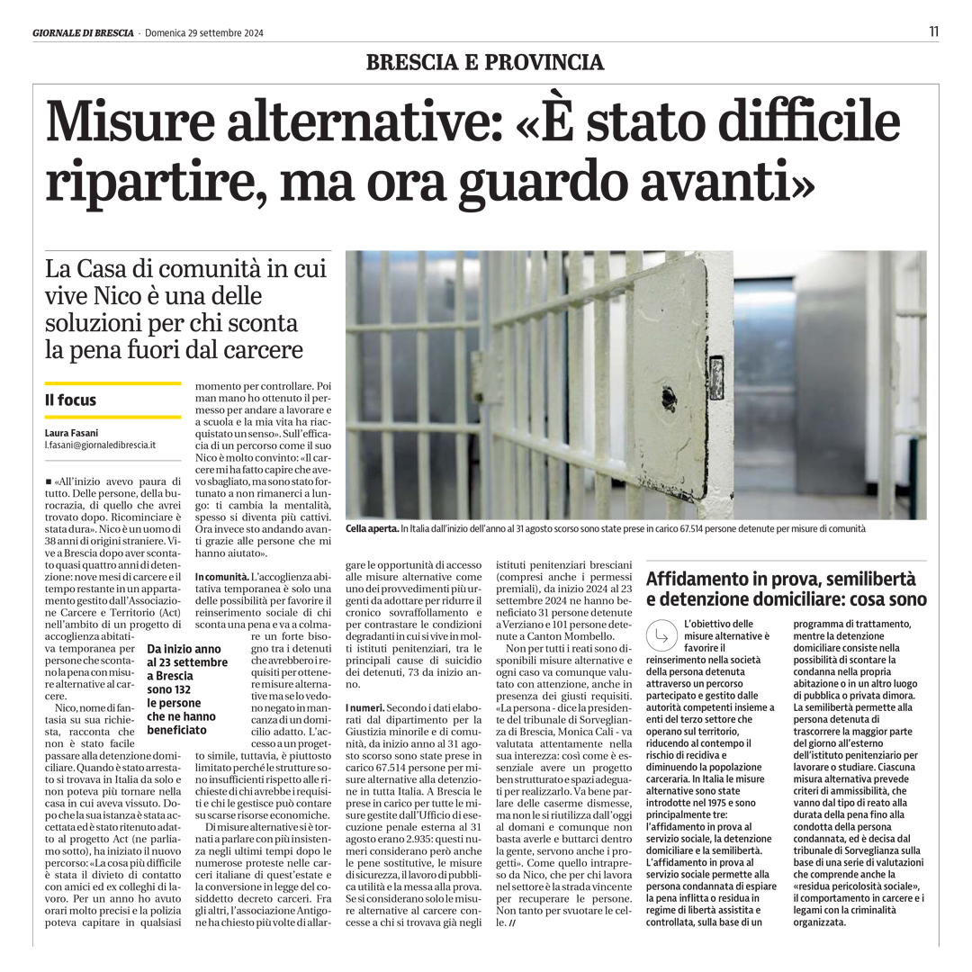 30 Settembre 2024 NewsFocus: misure alternative Sul Giornale di Brescia di domenica 29 settembre, un’intera pagina dedicata alle misure alternative alla detenzione. Si parla di Associazione Carcere e Territorio, di Cooperativa di Bessimo e di molto altro.