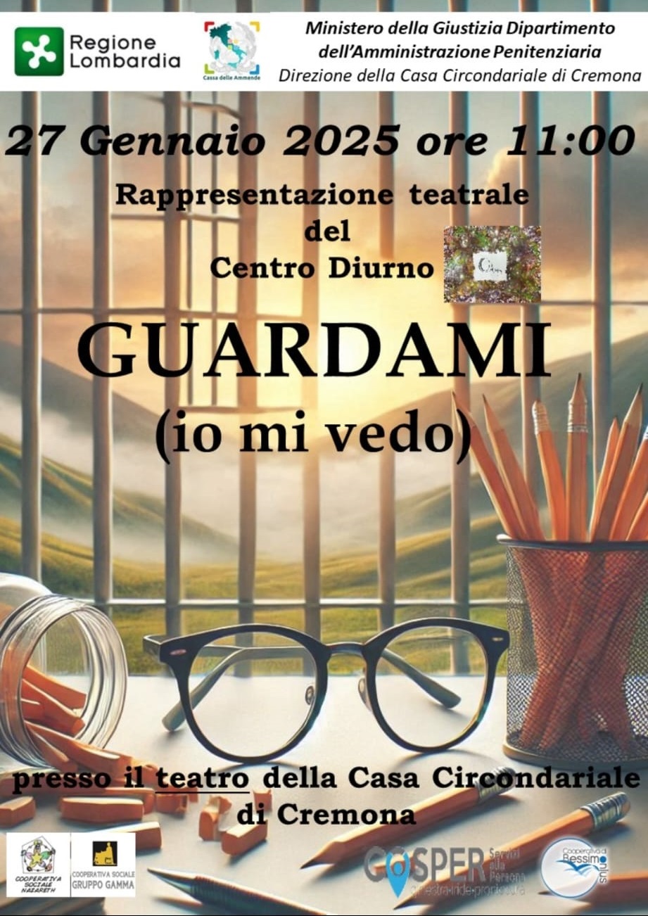 Lo scorso 27 gennaio 15 detenuti della casa circondariale di Cremona, hanno messo in scena «Guardami (io mi vedo)», una rappresentazione teatrale esito del laboratorio vocale / espressivo all’interno del Centro Diurno interno al penitenziario gestito da Cooperativa di Bessimo di cui è coordinatrice la collega Francesca Salucci.