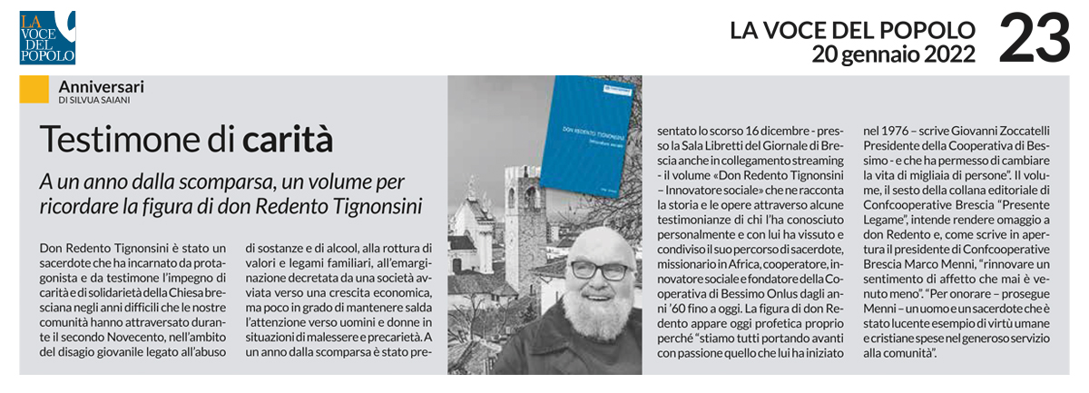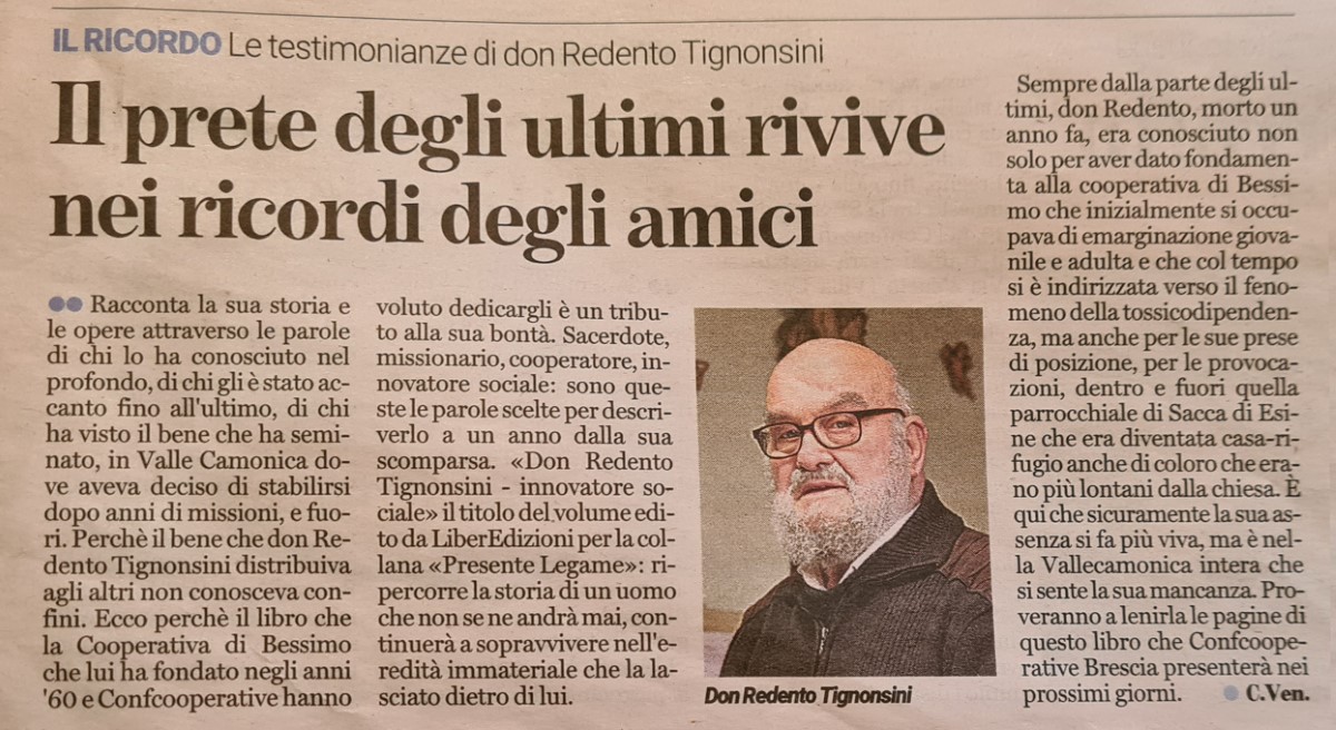 Il volume, intitolato «Don Redento Tignonsini – Innovatore sociale» ne racconta la storia e le opere attraverso alcune testimonianze di chi l’ha conosciuto personalmente – Palmina, Francesco, Guido e Cosetta – e con lui ha vissuto e condiviso il suo percorso di sacerdote, missionario in Africa, cooperatore, innovatore sociale e fondatore della Cooperativa di Bessimo ONLUS dagli anni ’60 fino a oggi.