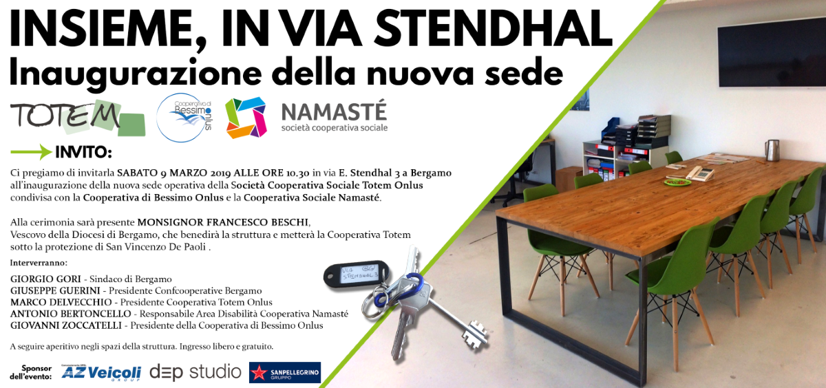 Sabato 9 marzo 2019 alle 10.30 sarà inaugurata la nuova sede di via Stendhal 3 a Bergamo in cui operano tre cooperative sociali: Cooperativa di Bessimo, Cooperativa Totem e Cooperativa Namasté.