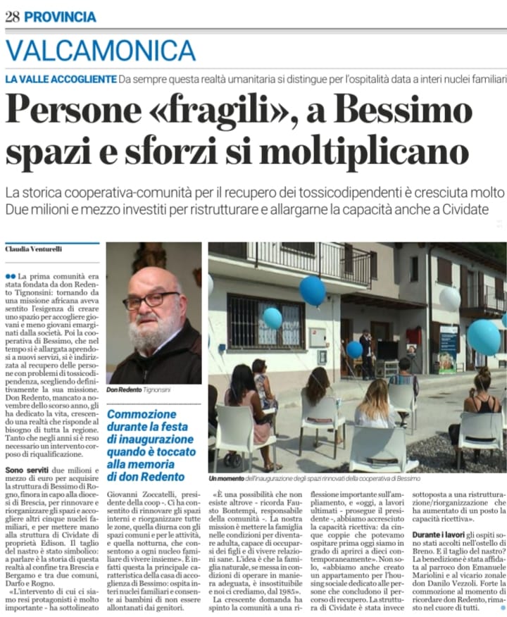 Ci siamo incontrati anche per celebrare l’acquisizione, da parte della Cooperativa di Bessimo, dell’immobile ove risiede la comunità di Bessimo, la prima Comunità della Nostra storia. La firma è stata apposta il 26 novembre 2020 esattamente 10 giorni dopo la scomparsa di Don Redento Tignonsini, il nostro fondatore (il 16 novembre 2020 n.d.r.) che ricorderemo anche oggi dedicandogli un momento durante l’evento: ci piace pensare che l’acquisto della sede in cui ha iniziato la sua opera (la comunità è stata aperta il 29 agosto 1976) e in cui per anni ha mantenuto la sua residenza, sia un’ennesima conferma della nostra volontà di continuare sul suo esempio e rafforzare la nostra presenza laddove lui è partito.