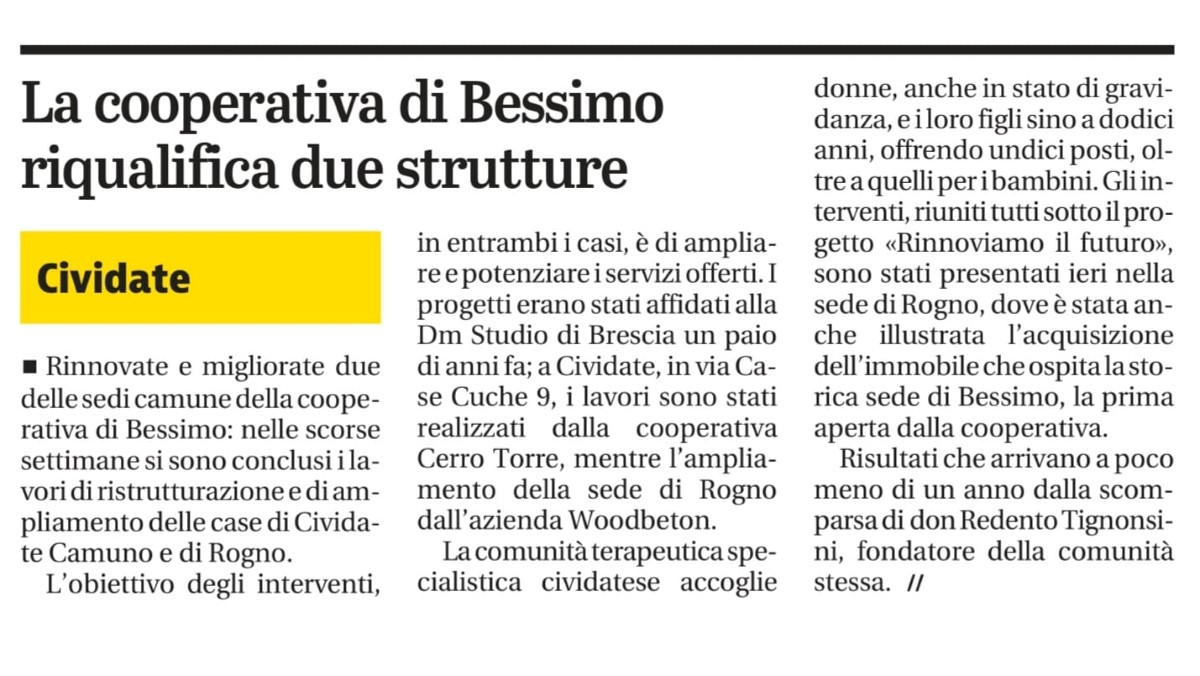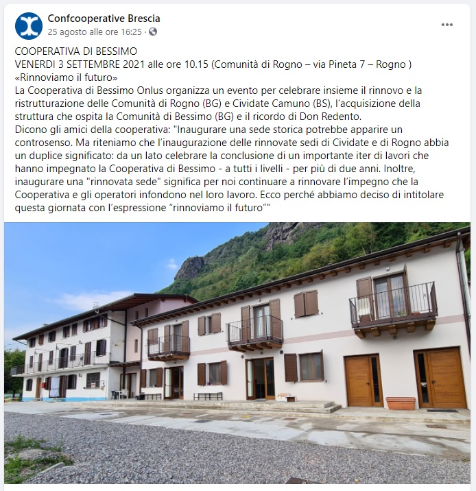 “Oggi siamo a festeggiare la conclusione dei lavori iniziati alcuni anni fa qui a Rogno, i lavori quasi terminati nella Comunità di Cividate Camuno oltre che per festeggiare l’acquisto della Comunità di Bessimo, casa da cui è partita tutta l’esperienza della nostra cooperativa.