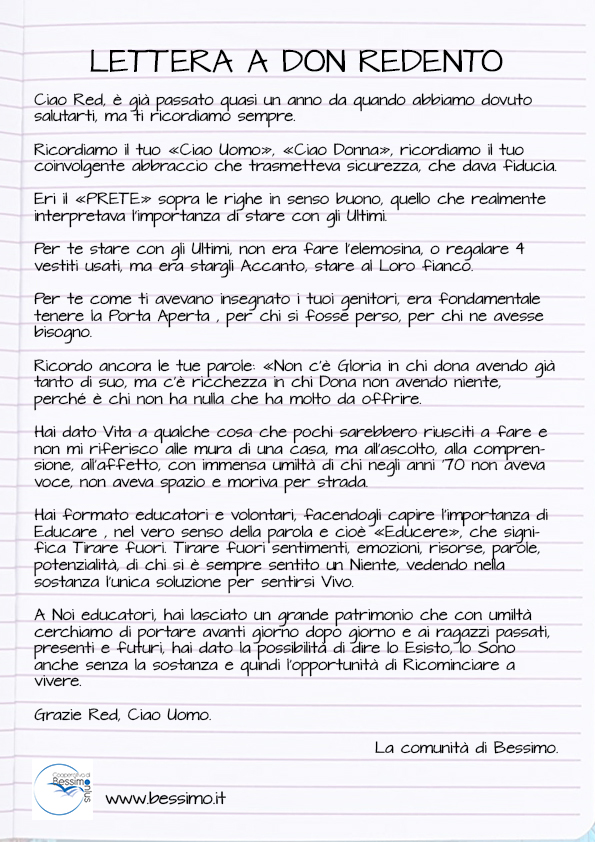 - La lettera a Don Redento scritta dalla Comunità di Bessimo