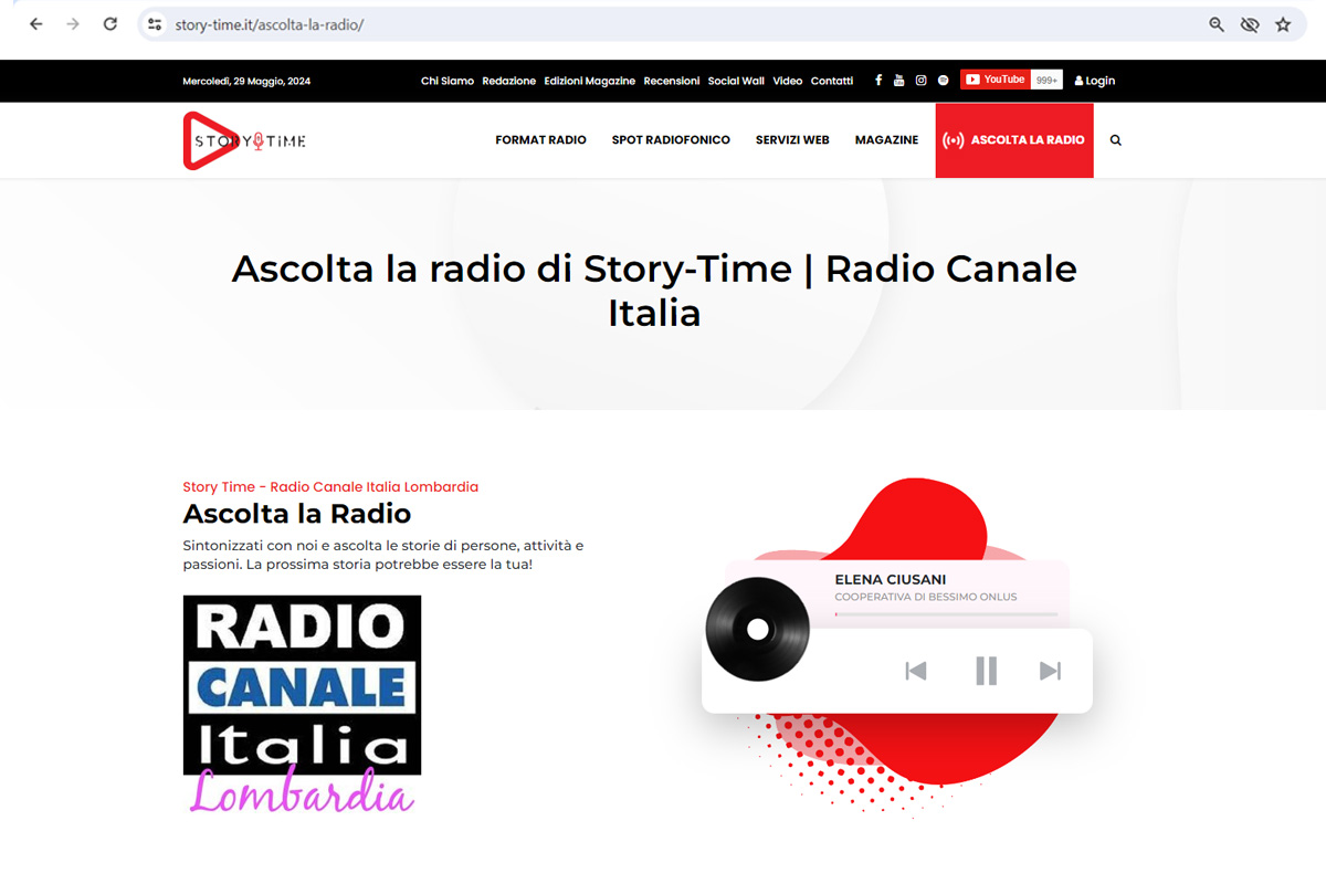 Ascolta l’intervista a Elena Ciusani, Presidente della Cooperativa di Bessimo ONLUS, ai microfoni di «Story Time» su Radio Canale Italia.