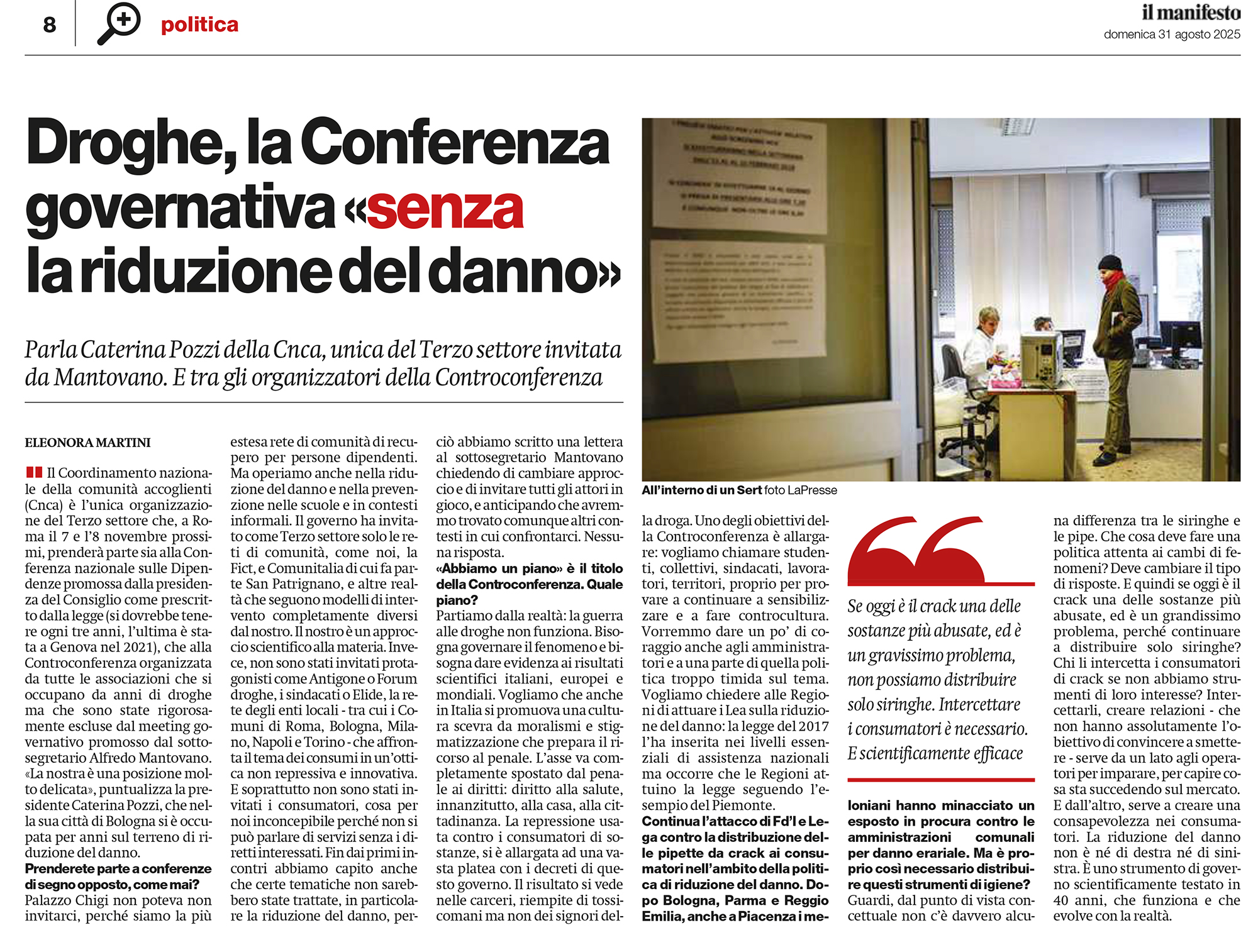 “Droghe, la Conferenza governativa «senza la riduzione del danno»”