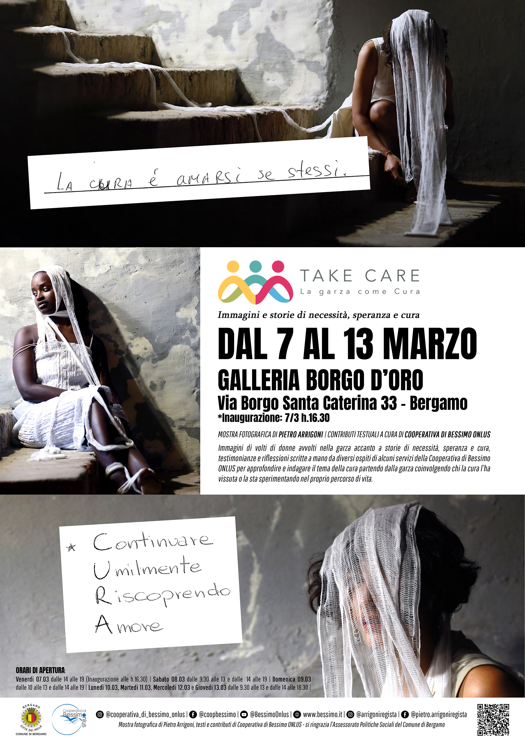 Dopo l’esperienza del #ProgettoRitratti, mostra fotografica multimediale esposta anche a Bergamo nel 2023 in occasione dell’Anno della Cultura di Bergamo e Brescia, Arrigoni e Cooperativa di Bessimo tornano insieme a Bergamo, grazie alla sensibilità dell’Assessorato alle Politiche Sociali del Comune di Bergamo, per proporre un’esposizione complessa e articolata sul tema della garza come cura: «Take Care – La garza come cura – Immagini e storie di necessità, speranza e cura».