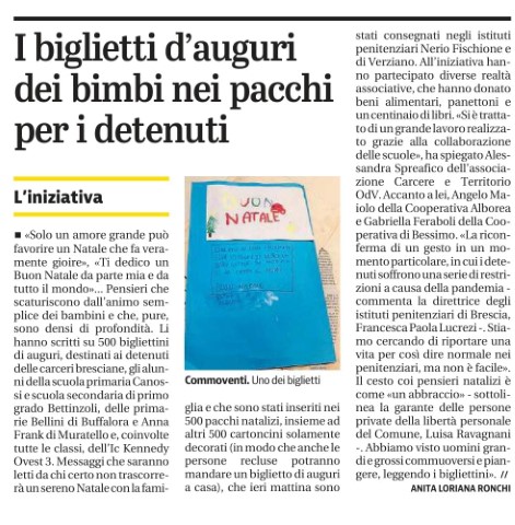 Infine, grazie a Alessandra Spreafico e a tutti i bambini delle scuole bresciane che è riuscita a coinvolgere: sono certa che i loro biglietti di auguri ai detenuti saranno in grado di trasformarsi in sincero abbraccio attraverso parole che noi adulti non saremmo mai stati in grado di trovare.